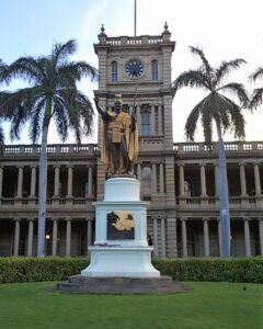 The famous statue of Kamehameha I that stands in front of the Hawaii State Supreme Court (Ali’iolani Hale) – the ruler who unified Hawaii under one monarch and become the first king of a unified Kingdom of Hawaii – is not the original statue. The original statue was temporarily lost at sea so a second statue was commissioned as a replacement and placed there instead. The original was eventually recovered and it stands in North Kohala on the Big Island.