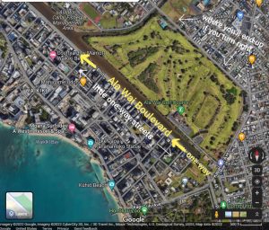 • It will often take more than one try to get a spot. If possible, look on a map PRIOR to going so you know which streets to turn into on the left AND which street to turn on in order to circle back around. Just assume you’ll have to circle back around a few times. Many of the streets are one-way but not necessarily alternating and I’ve often cut over too late or turned back onto Ala Wai Boulevard too early. Good luck!