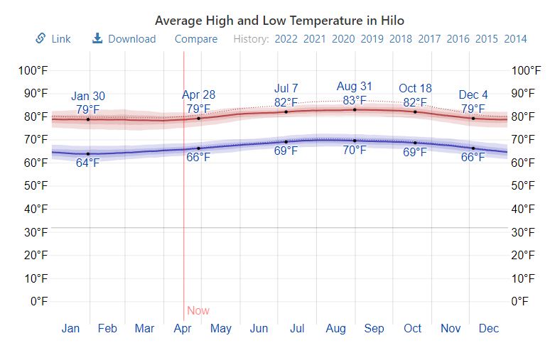 There are basically two main seasons throughout most of the Hawaiian Islands: a warm, drier “summer” season – from April to November – and a “winter” season – from mid-November to March – which has slightly cooler temperatures and wetter weather. *This is approximate, as I’ve had hot Decembers and chilly Septembers but, Hawaii weather is pretty nice year round, so I wouldn’t be too worried.