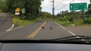 9:26 AM: There are two chickens crossing the road, so we wait for them to cross. This took a little longer than we expected so we got about 20 pictures of chickens crossing the road. Unfortunately, we never found out why the chickens crossed the road! Oh well.