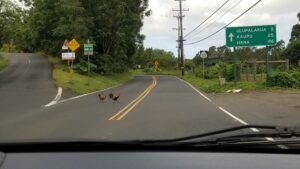 9:26 AM: There are two chickens crossing the road, so we wait for them to cross. This took a little longer than we expected so we got about 20 pictures of chickens crossing the road. Unfortunately, we never found out why the chickens crossed the road! Oh well.