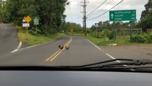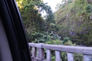 After about 45 min of driving, it becomes clear that we have entered the “reverse-road-to-Hana” drive. It gets curvy, like, really curvy, and hilly – you’re not only feeling the side-to-side curves but the up-and-down hills too. If you drive over 35 MPH, it’ll sometimes feel like you’re driving on a mild roller coaster. If you even have a slight chance of getting car/motion sick, we strongly recommend either taking the regular Road to Hana or taking some motion sickness medicine. Also, you’ll need to get your medicine in advance prior to starting this trek, by the way. By the time we were on this portion of the road, we had long past Target or any store that might have Dramamine. To give you an idea of the road we were on, even when driving, I felt a little car sick – it was weird. We used Dramamine and/or those wrist bracelets that use pressure points to help with motion sickness. Both seemed to have done the trick for us.