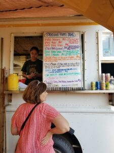 1:11 PM: The line was a little long so we finally got to order. (You can see in the picture that people are just kind of waiting and waiting.) By the time we got up to the front, quite a few options were no longer available. It wasn’t a weekend, but this week had the Independence Day holiday and it’s summertime so maybe this is just how it is?! Either way, we needed food and it was there – this truck is supposed to have quite a few raving reviews too! The food was fine but I think we’ll try another truck next time we’re in Hana.