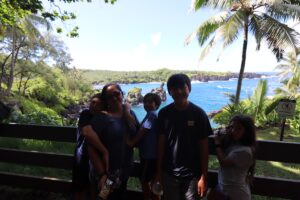 We made it to Hana! At this point we were pretty hungry, so we decided to take a break, enjoy the scenery, and grab some food. Shortly after entering Hana proper, we saw a patch of food trucks and vendors. We drove through the main part of the town before deciding to double back and go to the BBQ food truck closer to the entrance of Hana Town. Braddah Hutts BBQ Grill seemed to have the most options for our family (aka the picky 5-year-old) and we were beginning to get a little antsy about time. All in all, the food was…okay. Unfortunately for us, it was still peak lunch time so the food took quite a while to come out too. Normally, this wouldn’t have been a big deal, but we were pinched for time and there was no “fast food” in Hana. I think any food option at this point would have taken a little longer than we wanted. Oh well. Now, our departing flight is less than 6 hours away!